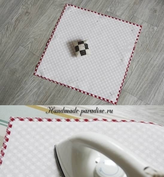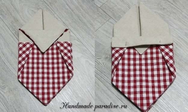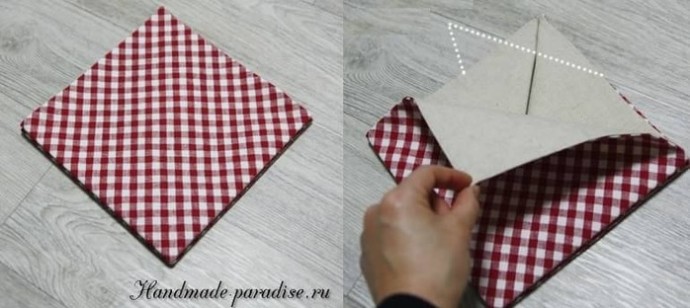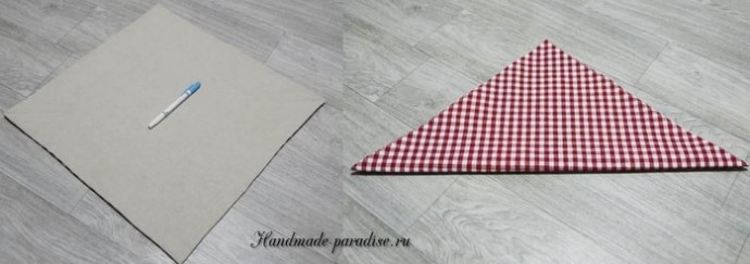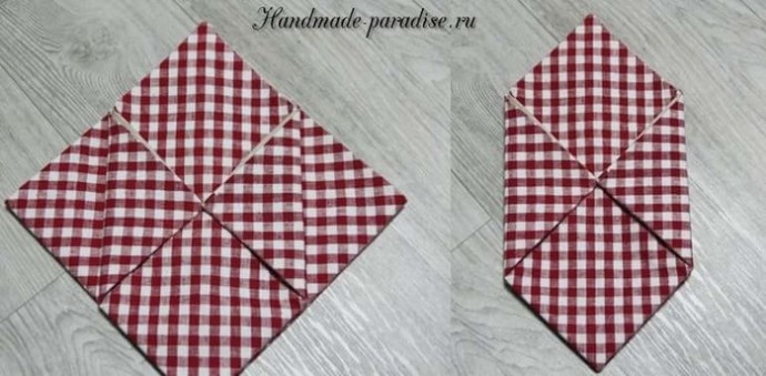 Сложив по диагонали и прогладив утюгом, раскрываем квадрат и складываем еще раз, по другой диагонали. Раскрываем и складываем, заложив уголки внутрь, как показано на фото ниже.