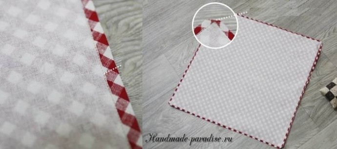 Сшиваем квадраты из лицевой и отделочной ткани, прокладывая строчку по краю флизелина. Оставляем на одной из сторон несколько сантиметров незашитыми, чтобы можно было вывернуть деталь. Углы полученной заготовки корзинки обрезаем, как показано на фотографии ниже.