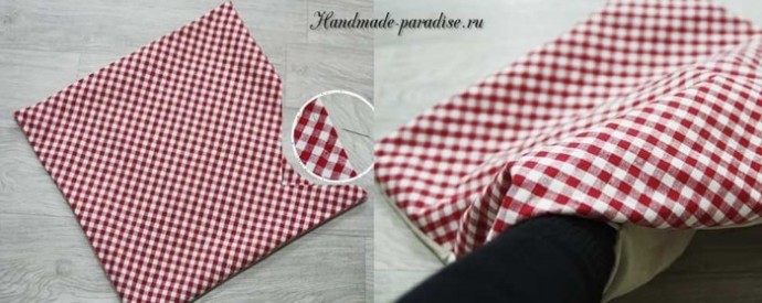 хлопчатобумажная ткань для лицевой стороны — в клеточку, хлопчатобумажная ткань для подкладки и отделки — однотонная, флизелин или клеевая ткань, нитки, иголки, швейная машинка, утюг, линейка или угольник.