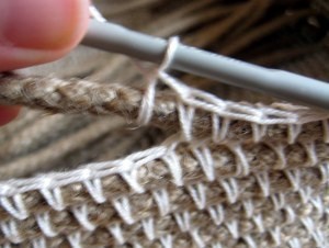 Закончить с подкожно в следующую петлю, но не через веревку. Обрежьте веревку при необходимости, и ткать во всех концах.