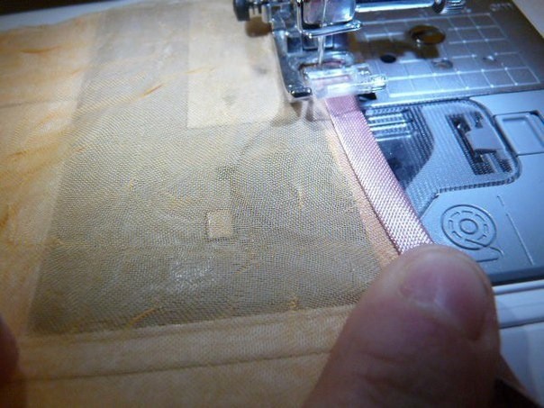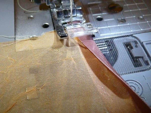 Складываем бейку пополам, вставляя в середину бейки ткань, можно предварительно подготовить бейку, проутюжив её утюгом так, чтобы нижний край выходил на 0,1 мм. Строчим,не забывая обращать внимание, чтобы нижний край бейки находился на 0,1 мм шире, чем верхний.
