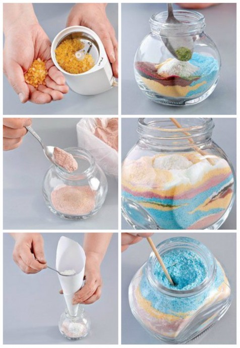 Рисунки из песка и солиМатериалы:стеклянная банка с плотно закручивающейся крышкойбелая морская сольцветная соль для ваннИнструменты: кофемолка тонкая деревянная палочка-шпа...