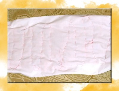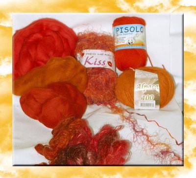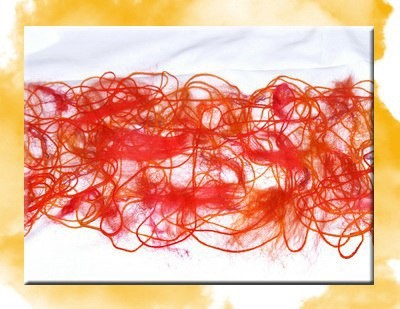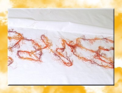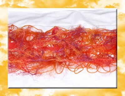 Материалы и инструменты: кусок ткани, в моем случае медицинская простыня, длиной 2 метра, шириной 50 см., пряжа трех видов, немного кудрявого мохера и три цвета мериносной шерсти. Простыню заутюживаем сложив вдоль пополам. Пряжу из нейлона я препарировала, вынув из нее плотную основу и оставив пушок.