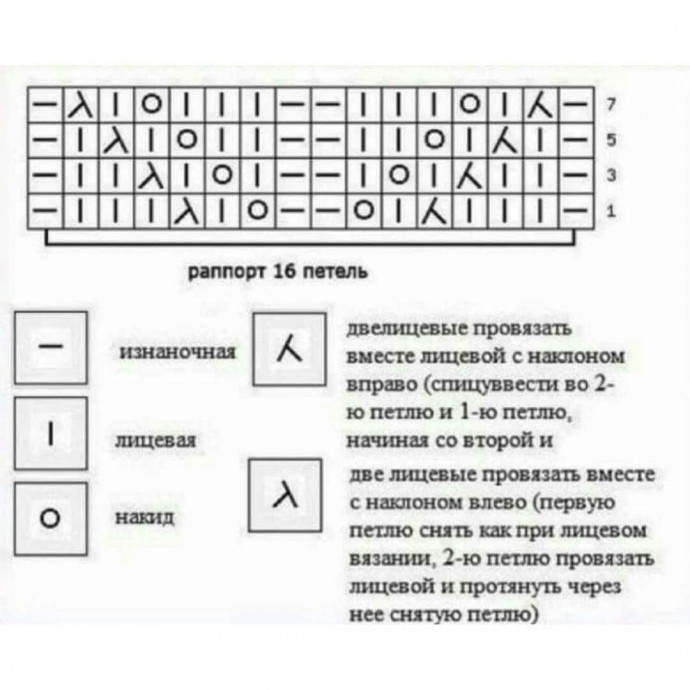 Узор в Вашу копилкуЧисло накидов должно соответствовать числу убавлений.Число петель 33+2Вязать по схеме, на которой приведены только лиц.р. В изн.р. петли вязать по рисунку, ...