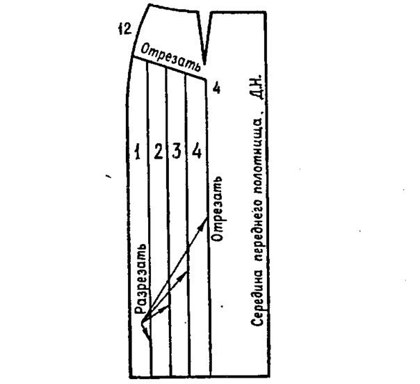 Обведите основную выкройку переднего полотнища юбки. Нанесите линию подреза, отложив по линии бокового среза 12 см. Линию бедер разделите пополам и отложите вверх 4—5 см, а вниз проведите прямую, параллельную линии середины переднего полотнища юбки. Соедините точки 12 и 4. Разделите полученную линию на количество складок (4) и проведите вниз параллельные линии. Пронумеруйте детали. Разрежьте выкройку по намеченным линиям и отрежьте боковую часть юбки по линии подреза.