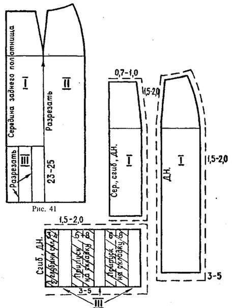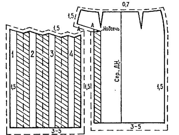 Обведите основную выкройку заднего полотнища. Нанесите фасонные линии — от конца вытачки до линии низа параллельно линии середины юбки. Наметьте линию подреза на расстоянии 23—25 см от линии низа, в зависимости от длины юбки. Разрежьте выкройку по намеченным линиям и сделайте припуски на швы. Третью деталь разрежьте, разделив ее на 3 равные части, и раздвиньте на выбранную ширину складки. Выкроите хлястик на 2—3 см длиннее линии подреза, шириной 8 см (в готовом виде — 4 см) с припусками на шов 0,7 см по всему контуру.