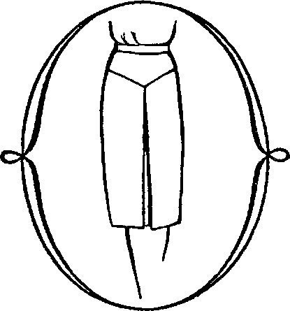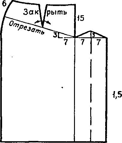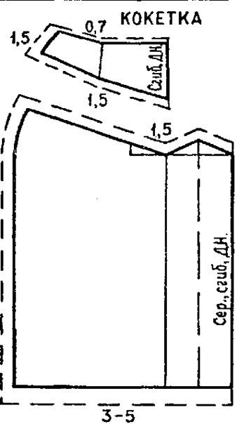 Если кокетка имеет более сложную форму в виде ломаной линии, то ее нижний срез надо обработать обтачкой. Для этого переведите нижний срез кокетки на бумагу, причертите к этой линии на расстоянии 3—4 см параллельную линию и вырежьте. У вас получилась выкройка обтачки. Приложите обтачку лицевой стороной к лицевой стороне кокетки и притачайте. При этом припуски на шов на обтачке и кокетке должны быть 0,7—1 см. Обязательно сделайте надсечки в углах к строчкам, иначе вы не сможете вывернуть обтачку. Перегните обтачку на изнаночную сторону и приутюжьте. Затем наложите кокетку на нижнюю часть юбки и настрочите.