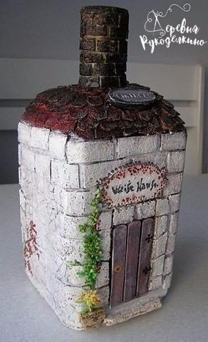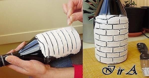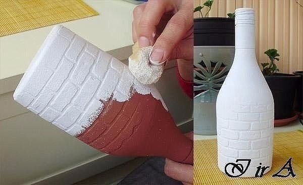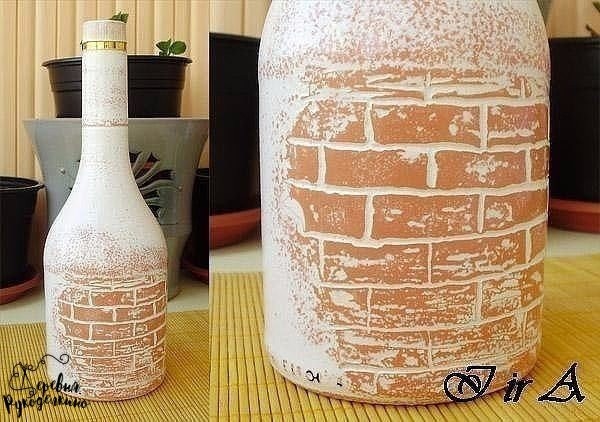 Снимаем с бутылки этикетку, обезжириваем бутылку и приступаем к работе. Наносим шпатлевку, тонким слоем, приблизительно 2 мм. Выравниваем поверхность шпателем. С помощью зубочистки или спички проводим по бутылке линии, имитирую кирпичную кладку. После полного высыхания затираем покрытие шкуркой. Теперь с помощью губки наносим акриловую краску кирпичного цвета в 3-4 слоя. После высыхания красим бутылку в белый цвет акриловой краской - 1 слой. И снова проходим нашу кирпичную кладку шкуркой. Вот и результат! А теперь можете использовать декупаж салфетками или просто покрыть бутылку лаком.