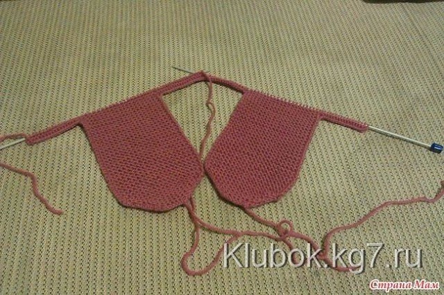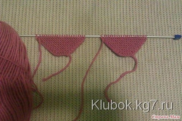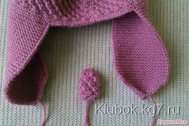 Набираем на спицу первые 17 петель, добавляем первое ухо, набираем центральные 37 петель, добавляем второе ухо, набираем последние 17 петель. Всего 111 петель. Провязываем все петли 4 ряда платочной вязкой.