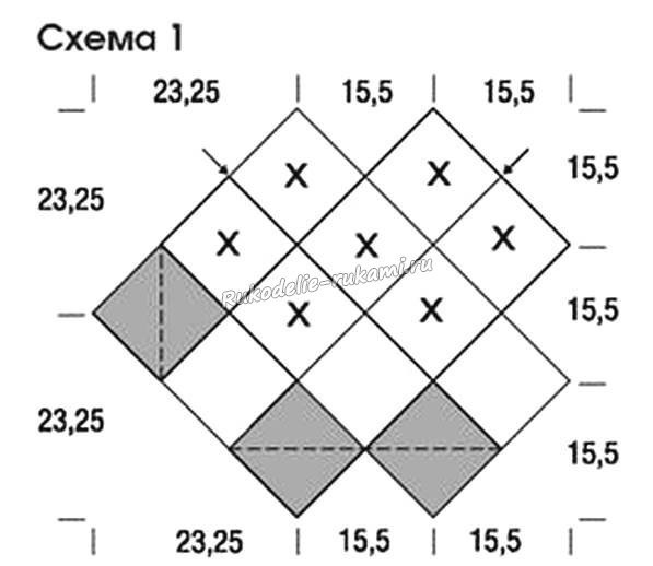 Плотность вязания: 1 квадрат = 11 х 11 см; от вершины до вершины = 15,5 см.