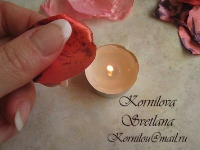 Пион из тканиС помощью свечи можно обработать края листьев.