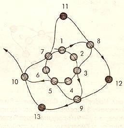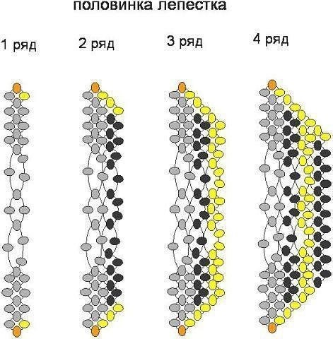 Техника монастырского плетения (как выяснилось экспериментально) сглаживает любые его неровности и недостатки. Каждый лепесток цветка плетётся отдельно техникой «крестик» или «монастыркое плетение», затем готовые лепестки сшиваются. Половинки лепестка можно сшивать между собой как крестиком, так и мозаичным плетением. У меня внешняя сторона лепестка сшита мозаичным плетением, а внутренняя сторона - крестиком. После сшивания лепестков оформляется серединка: добавляем подходящие бисерины и бусины и объединяем их в кольцо. Половинки лепестка цветка имеют две общие бисерины. На рисунке они выделены оранжевым цветом. Остальные цвета для наглядности заменены похожими: серебристый – на серый, белый – на жёлтый.