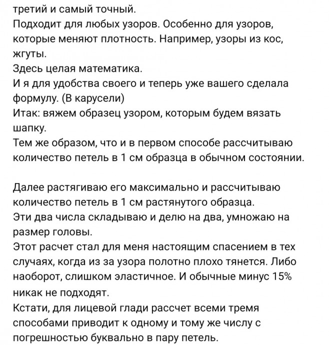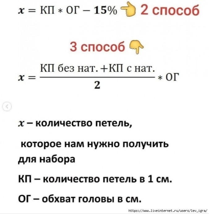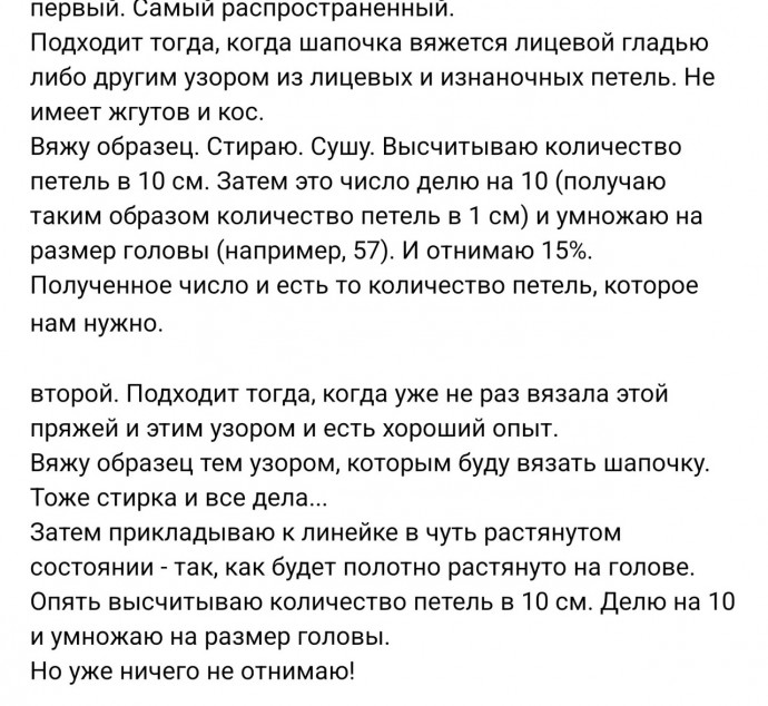 3 способ: задачка для третьего класса. Рассчитать по образцу в «спокойном» и в максимально растянутом состоянии количество петель в 1см, найти среднее арифметическое и умножить на обхват головы. Например, в свободном состоянии 1см =4 петли, в растянутом 1см =2 петли, складываем 4 и 2, сумму делим пополам, полученное число умножаем на 56: