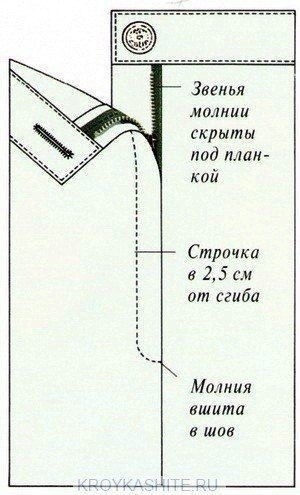 Вшивание молнии под планку Так вшивают молнию на брюках или юбках, иногда — на пальто и куртках. При таком способе вшивания расходуется больше ткани на верхнюю и подкройную нижнюю (защитную) планки и используется только в тех случаях, если он предусмотрен выкройкой.