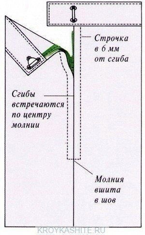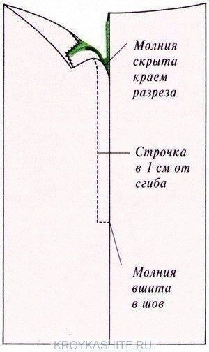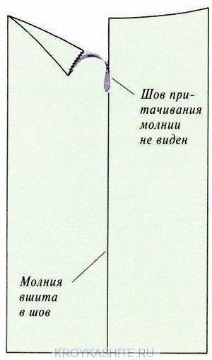 Вшивание молнии под складку При таком способе вшивания молнии, ее цвет не обязательно подбирать к цвету изделия. Так как она полностью скрывается складками одежды. Так вшивают молнии в боковые швы различных изделий, где молнию не должно быть видно. Например, платьев или юбок.