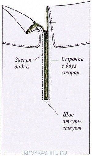 Вшивание разъемной молнии Обычно вшивается так, что звенья видны. Второй способ втачивания — со скрытыми звеньями.