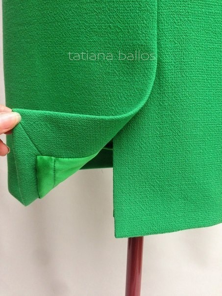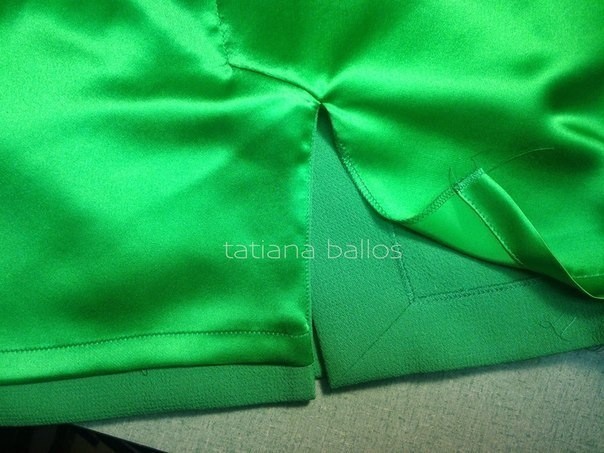 Обе стороны шлицы продублировать клеевой прокладкой. Соединить средний шов спинки , верхний срез шлицы, недоходя 1см до края. При разутюженном среднем шве , надсечь уголок к точке начала шлицы, или заутюжить наискосок , как на фото (при интенсивном ношении юбки, или платья , надсечённый угол может оказаться слабым местом)