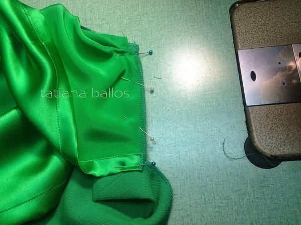 Отогнуть припуск подгибки на изнаночную сторону и застрочить. Соединить правую сторону шлицы с подкладкой Отутюжить.