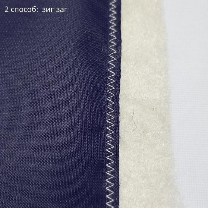 Область применения: пошив утеплённых изделий любого вида, на утеплителе средней и высокой поверхностной плотности. ⠀ Достоинства: широкая строчка позволяет надёжно настрочить деталь на утеплитель, что делает последующее стачивание деталей между собой значительно проще и удобнее, позволяет избежать перекосов и затягиваний ткани верха и утеплителя между собой. Это особенно актуально при изготовлении изделий на толстом утеплителе. ⠀ Недостатки: зигзагообразную строчку проблематично распороть, поэтому использовать её в швах, в которых будет необходимо высечь припуск утеплителя, нежелательно. Кроме того, этот способ потребует большего расхода ниток, нежели первый.