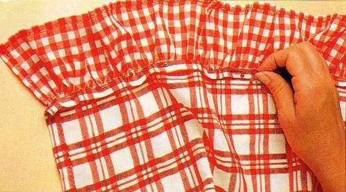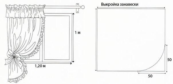 Для штор: 2 полотнища 140 см шириной 150 см, скруглив нижние края по выкройке;