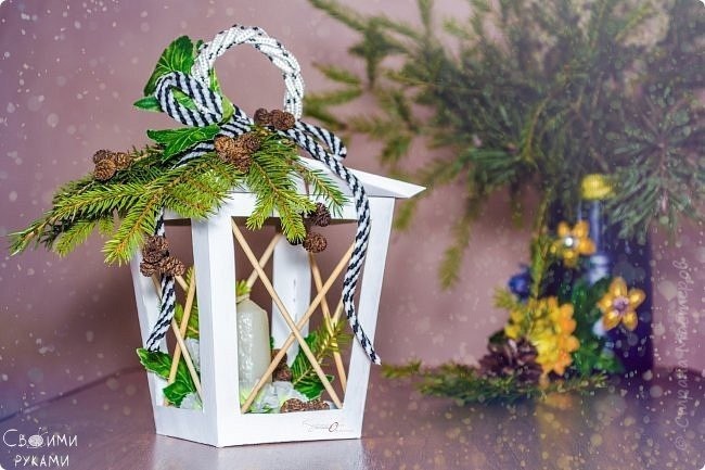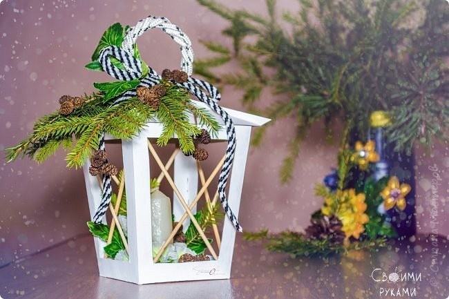 Клеим новогодний фонарик из картона и добавляем внутрь красивые предметы декора.