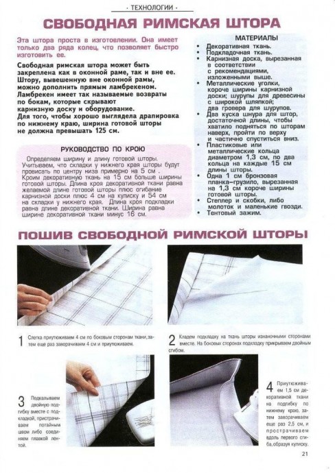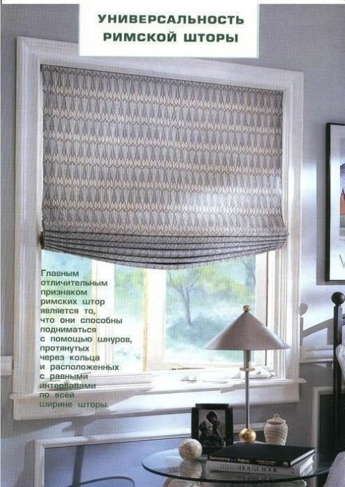 Римские шторы в современной версии - это полотна прямоугольной формы из различных натуральных или искусственных тканей, которые закреплены на карнизе. Подъем и опускание шторы производится при помощи специального механизма. С изнаночной стороны шторы, через 30 - 40 см полотна вставлены специальные фиберглассовые вставки, которыми фиксируют складки при подъёме, для придания им правильной формы. В отдельных видах штор планки могут и отсутствовать.