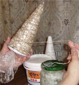 Совет: положите катушку в банку с клеем, конец нити пропустите через дырку в крышке. Так нитки равномерно смачиваются клеем, меньше путаются и не вымазывают рабочую поверхность.