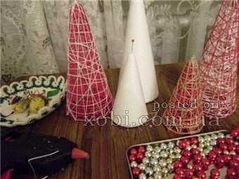 Декорируем елочку с помощью бусин и клеевого пистолета.