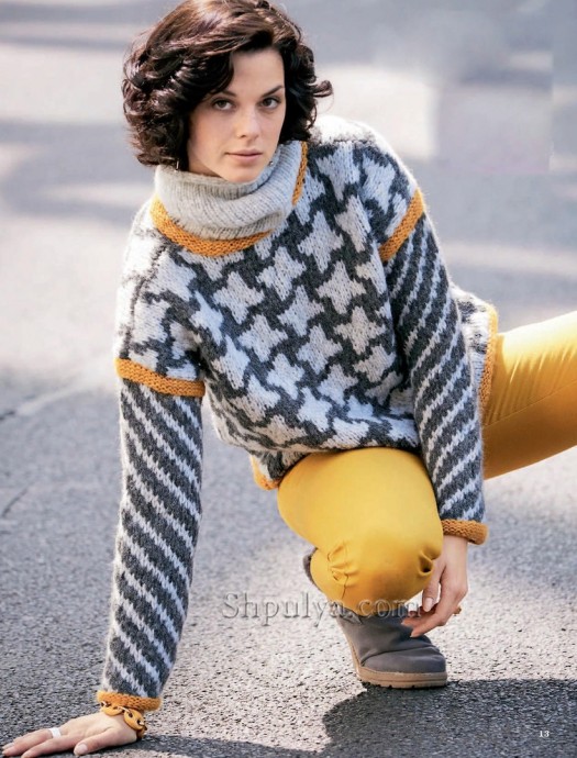 Сборка. Выполнить плечевые швы. Для воротника гольф желтой нитью на круговые спицы № 6 набрать по краю горловины 64 (66) 68 п. и сначала связать 1,5 см = 5 круг. р. узором 1. Продолжить работу светло-серой нитью узором 2, при этом в 1-м круг. р. равномерно убавить 8 п. = 56 (58) 60 п.
