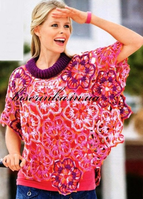 Пряжу можно брать не обязательно тех цветов, которые указаны. Главное чтобы цвета пряжи хорошо сочетались и гармонировали. Пончо вяжем следующим образом Цветок. вяжем по указанной схеме. Сначала набираем цепочку из нужного количества воздушных петель, замыкаем её в колечко, делаем воздушные петли подъёма на следующий ряд, и вяжем далее по схеме. Не забываем менять цвета ниток при вязке цветочков.