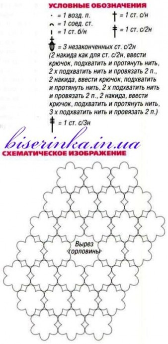 Рельефный узор: столбик с накидом, при этом начинаем с трёх воздушных петель подъёма, вместо одного столбика с накидом и заканчиваем одним соединительным столбиком в воздушную петлю подъёма. и все следующие ряды вяжем следующим образом: попеременно провязываем один рельефный столбик с накидом за переднюю стенку и один рельефный столбик с накидом за заднюю стенку. Для рельефных столбиков с накидом за переднюю стенку делаем накид, вводим крючок спереди назад в нижнюю петлю ы выполняем один столбик с накидом. Для рельефных столбиков с накидом за заднюю стенку делаем накид, вводим крбчок сзеди вперёд в нижнюю петлю и выполняем один столбик с накидом. Всего для пончо нам нужно связать 28 цветочков. Для того, чтобы соединить цветочки, мы вместо 3 воздушных петель вяжем следующим образом: одна воздушная петля, присоединяемся одним столбиком без накида к противоположной арке, одна воздушная петля. Располагаться цветочки на пончо должны следующим образом: (см. схему)
