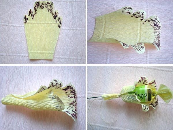 Лилия из гофрированной бумаги и конфет - отличный подарок к празднику.