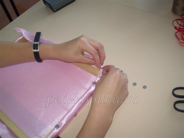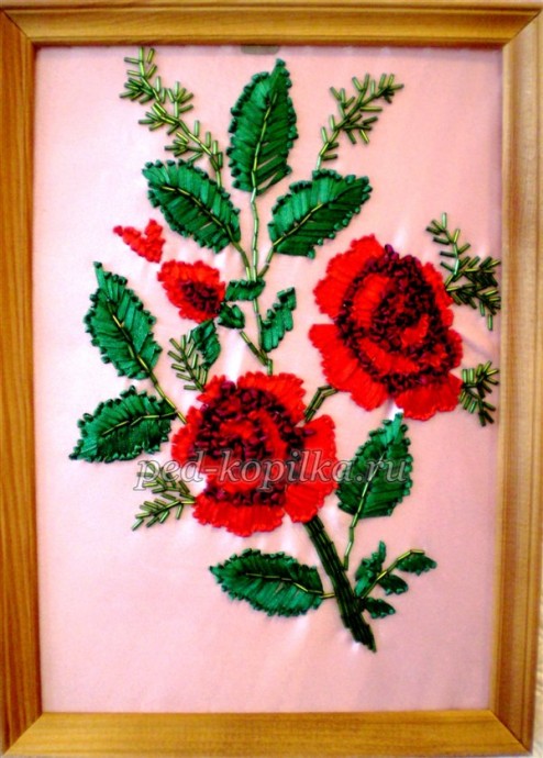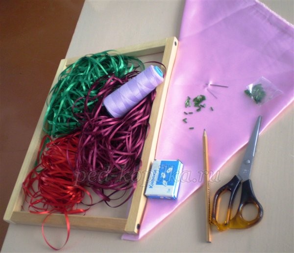 Материалы и инструменты: креп-атлас розового цвета , лента атласная 0,3 мм (красная, бордовая, зеленая), нитки х/б (розовые), ножницы, игла с большим ушком, бисерная игла, карандаш простой, подрамник формата А4, кнопки канцелярские.