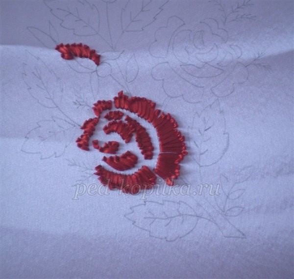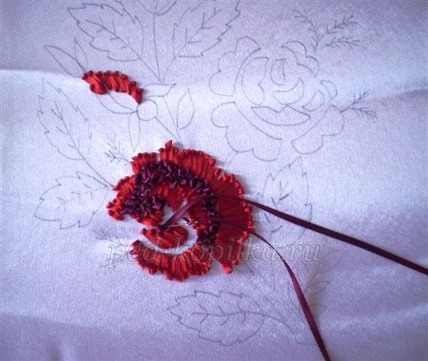 3. Вышиваем лепестки розы укладывая стежки от центра к краю, используем «японский ленточный стежок» Вытяните ленту нa лицевую сторону, расправьте ленту, сделaйте стежок нужной длины. После чего прижмите ленту пaльцем левой руки, проколите ее точно посередине и вытяните ленту через прокол нa изнaночную сторону, подтягивайте до тех пор, пока края ленты не завернутся