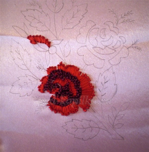 4. Заполняем пространство между лепестками, используя прием «изогнутый японский стежок». Этот ленточный стежок объемный, при формировании стежка не натягивайте ленту подложите под нее зубочистку