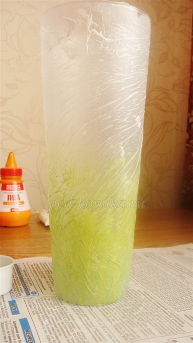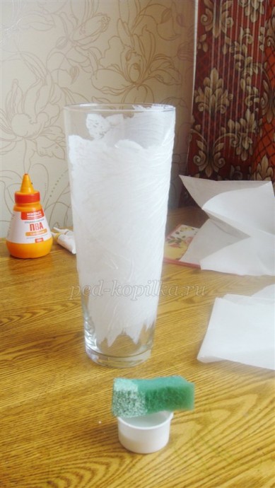 Если вы решите использовать ПВА, придется еще думать (или пробовать) использовать его в разведенном или не разведенном виде. Чаще всего его разводят обычной водой в пропорции 1:1. Когда используют такой клеящий состав, надо быть готовым к тому, что от воды салфетка размокает, может тянуться в разные стороны, от неосторожных движений рваться. В общем, надо приспособиться.
