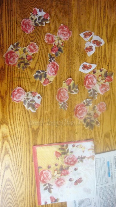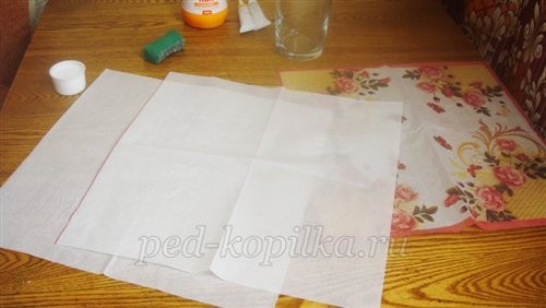 Для начала надо решить, в каком виде салфетку использовать. Если поверхность плоская, ее можно клеить целиком.На изогнутую поверхность целую не приклеишь. Нужно ее делить на фрагменты. Их можно: вырезать; рвать.