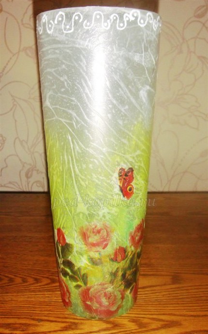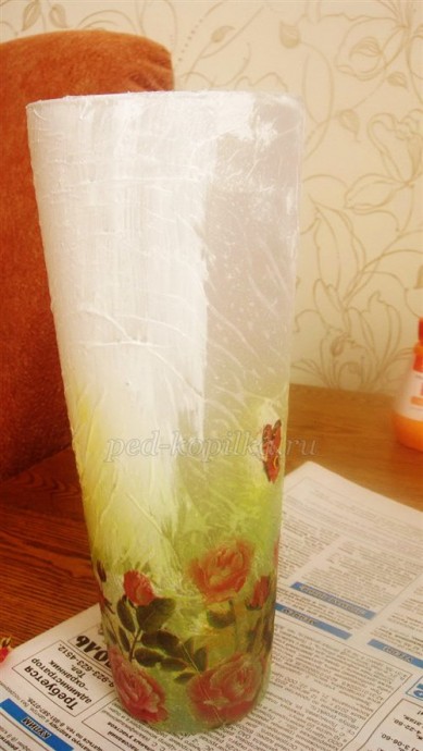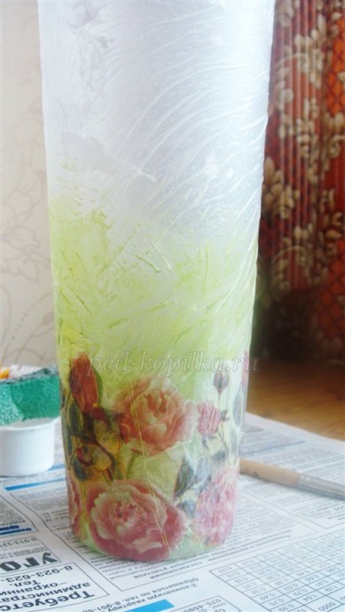 Этап нанесения белой краски обязательный. Дело в том, что салфетки очень тонкие, а при приклеивании они становятся полупрозрачными. Если они наклеены на белую поверхность, рисунок остается по-прежнему ярким. Если поверхность цветная или темная, он заметно блекнет, нет должного эффекта. Потому краску надо наносить даже на пластик или керамику и, возможно, в несколько слоев.
