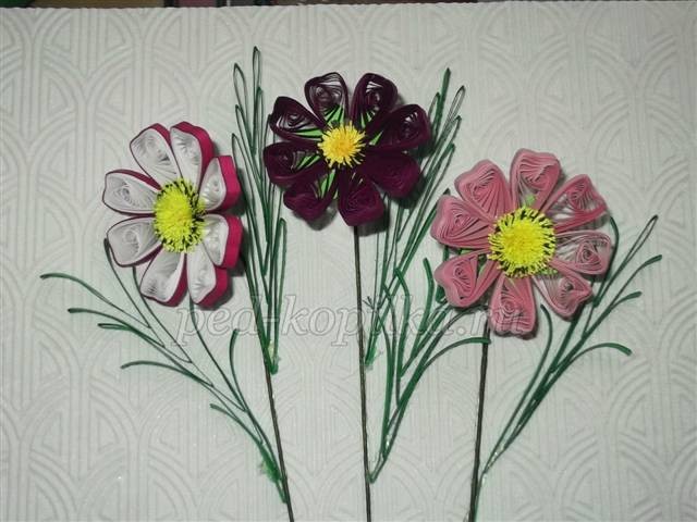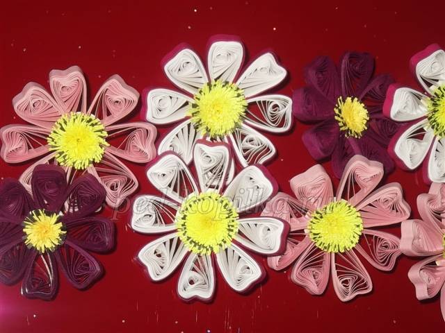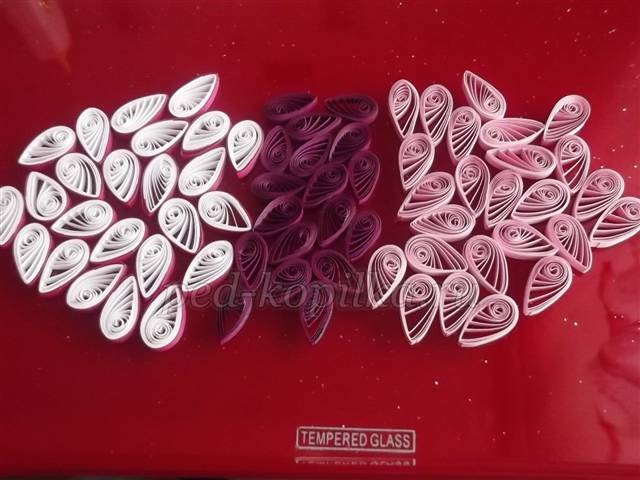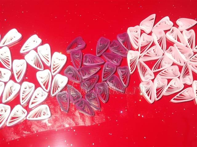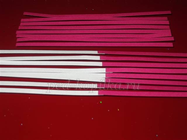 1. Каждый цветок состоит из восьми лепестков. Берем полоску для квиллинга (в моем случае малинового цвета) и разрезаем на три равные части. Склеиваем целую полоску белого цвета и одну часть малиновой.