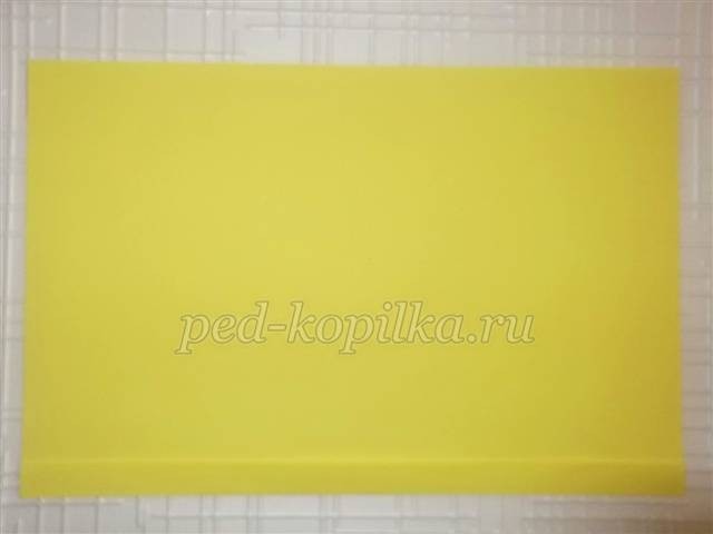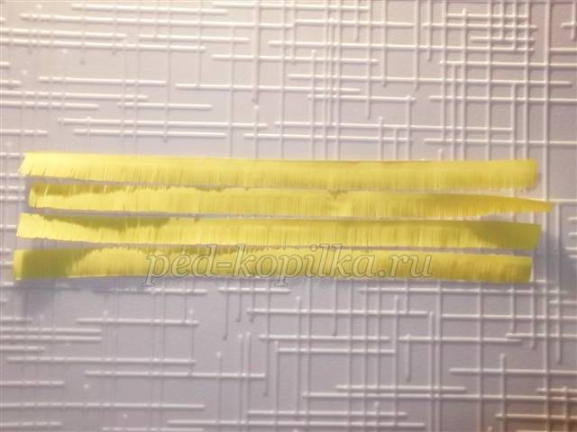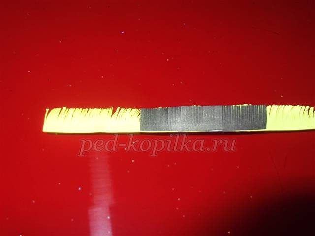 7. Осталось сделать серединку. Будем нарезать мелкую бахрому. Лист офисной бумаги желтого цвета складываем четыре раза по длине, чтобы одновременно сделать несколько заготовок. Ширина каждой полоски 1 см, а длина 29. Аналогичную работу проделать с черной бумагой. Хватит и одной полоски.