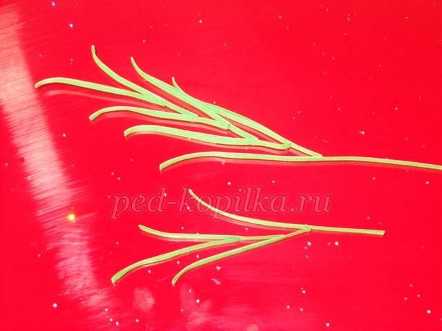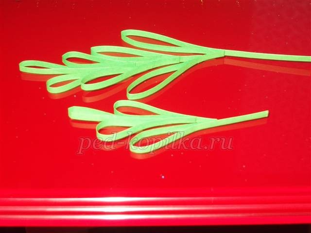 12. Переходим к изготовлению листьев. Если хотите маленькие – берем одну полоску, если большие – склеиваем две вместе.