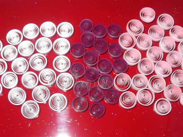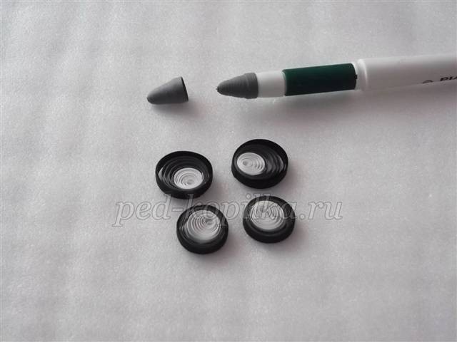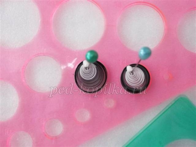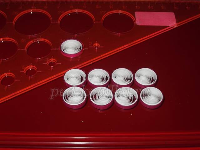 2. Склеенную полоску бумаги скручиваем в ролл и распускаем на трафарете окружностей в диаметре 14 мм. Закрепляем клеем.