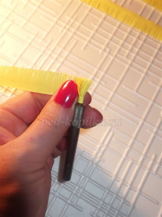 10. При помощи инструмента для квиллинга скручиваем бахрому в тугой ролл. Черная бахрома должна находиться в конце ролла. Приклеиваем конец полоски.
