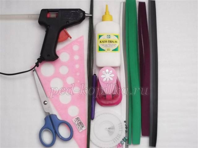 Для работы необходимо: цветная офисная бумага, ножницы, клей ПВА, инструмент для квиллинга, горячий клей, полоски для квиллинга 3 мм, трафарет окружностей, булавки, обои, рамочка, фигурный дырокол, проволока, зубочистка.