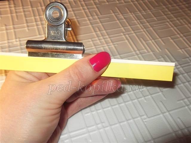 8. Затем взять полоску плотного картона шириной 3 мм. Зафиксировать при помощи зажима к полоскам, которые будем нарезать. (Картон нужен для того, чтобы не прорезать полоску на сквозь. Размер бахромы будет одинаковым). Приступаем к нарезке бахромы.