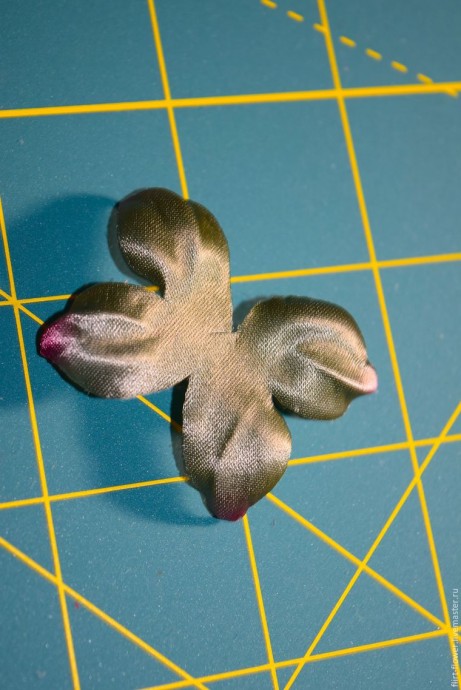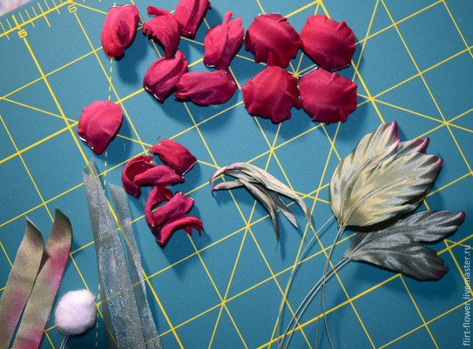 Далее я сделала разрезы на маленьких и средних лепестках. Все листья и подклейки я приклеила на искристую органзу (мне нравится сияющий блеск этой ткани).
