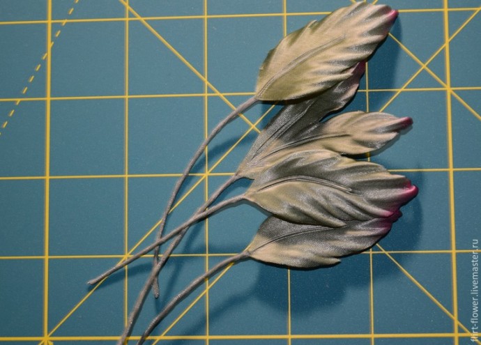 После обработки листьев двойным ножом с изнаночной стороны и вдоль проволоки с лицевой, я обмотала их стебли полосками искристой органзы.