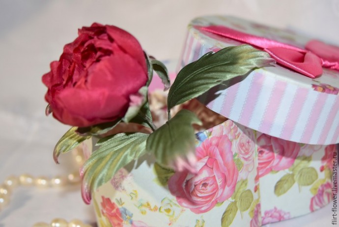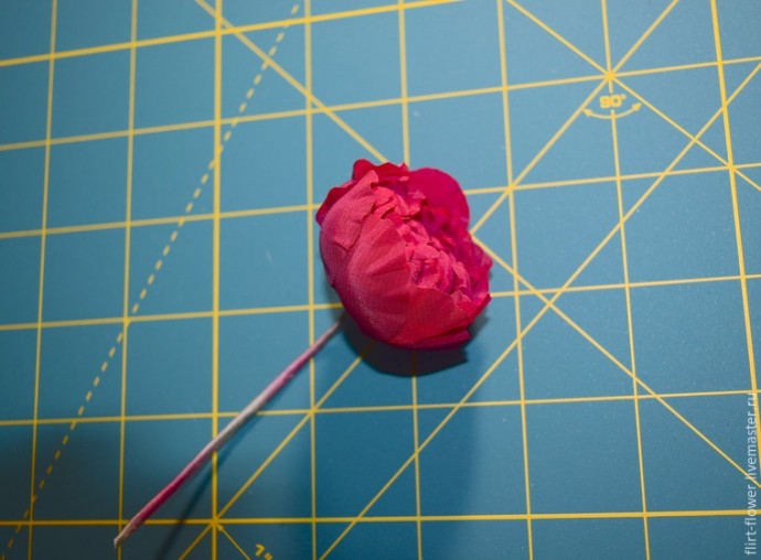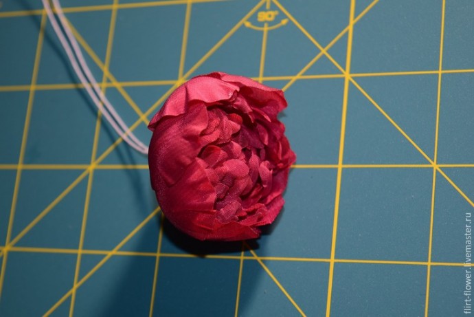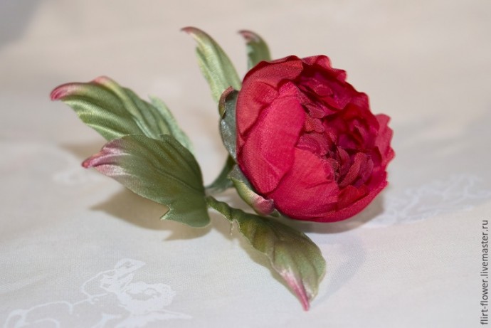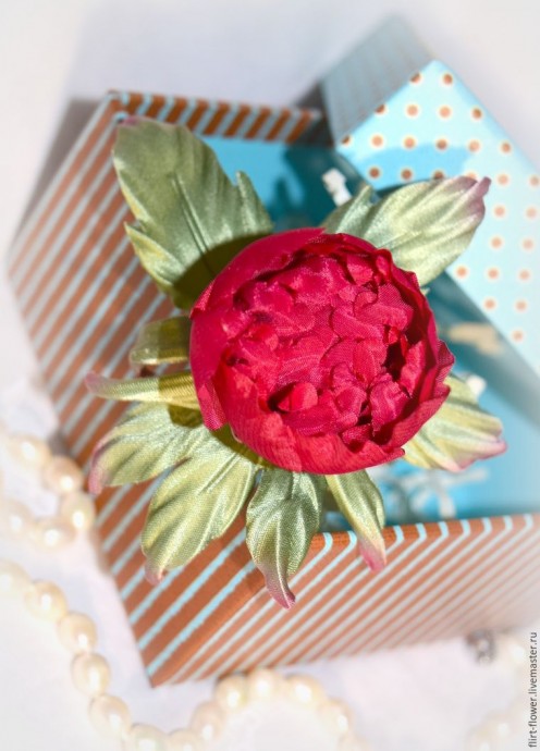 Наш пион готов. Его высота около 10 см, диаметр цветка около 4 см. По желанию вы можете прекрепить к нему булавочку и носить, как брошь.