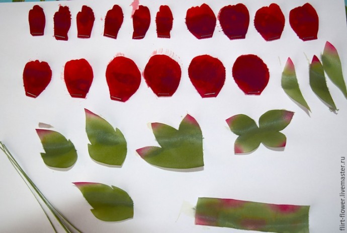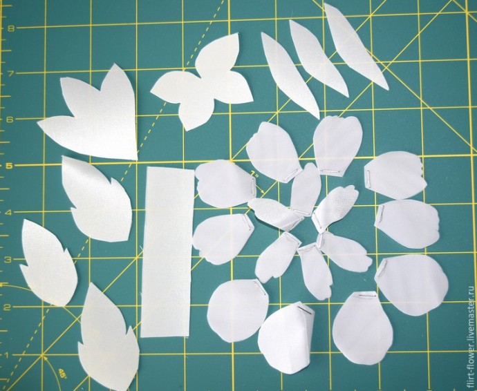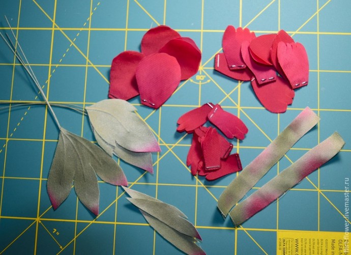 Вырезаем детали по косой. У меня три листика, один тройной лист, одна подклейка, три подклейки в виде длинных листиков, пара лепестков для закрытия ватной серединки, шесть пар маленьких лепестков, шесть пар средних и четыре пары больших, полоска для стебля цветка и для окончательной обмотки готового пиона.