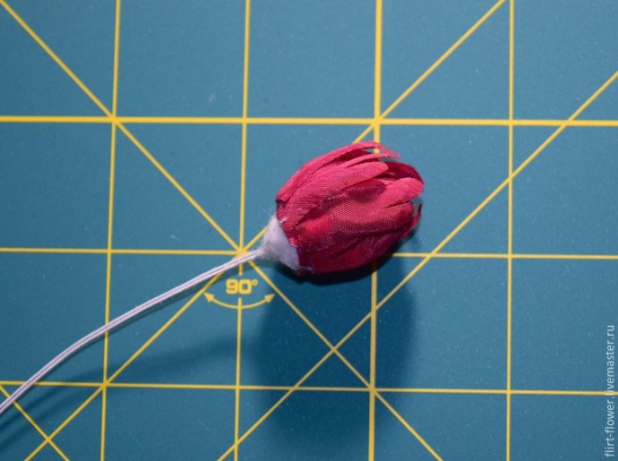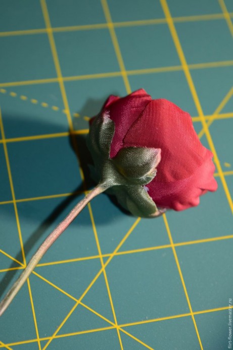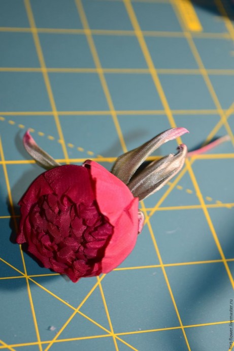 Приставляю листья и выбираю наиболее подходящее положение для них. Благодаря гибкости проволоки у готового пиона листочки можно размещать так, как нравится. Обматываю стебель цветка с листьями по косой оставшейся полоской ткани шириной около 1 см и длиной 5-7 см.